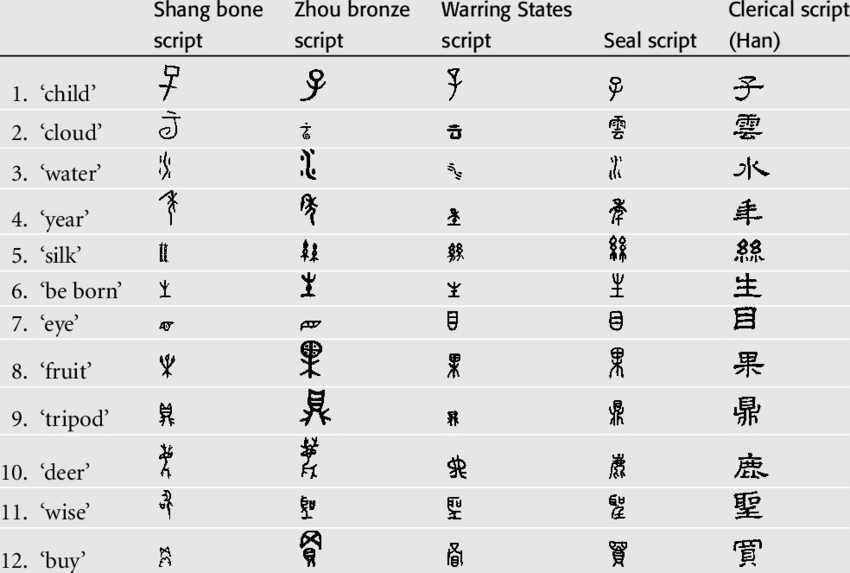 Image source: Peyraube, A. (2008, January) Development of the Chinese script. Ancient Chinese. https://www.researchgate.net/figure/1-Development-of-the-Chinese-script_tbl1_288175955
