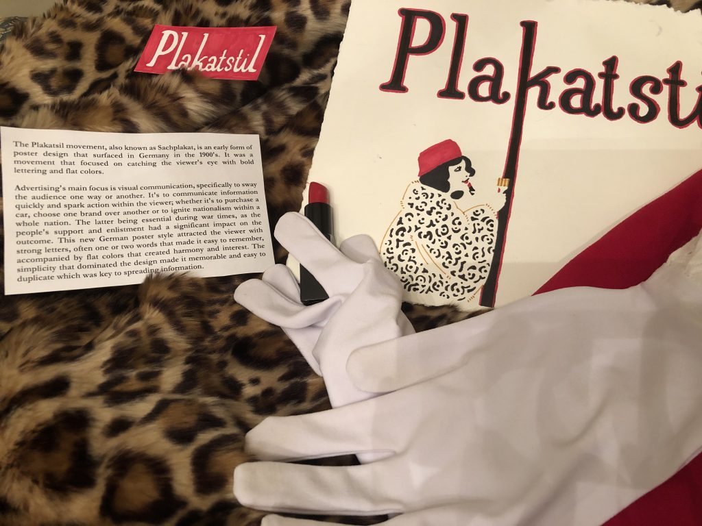 I noticed that Hans’ work usually includes a figure, with clothing that disappears into the background, and type that looks hand-written and unique to each design. Since type was meant to be the centre of attention in the Plakatstil movement, I placed it at the top and outlined it in a bright red. I chose a minimal color palette, consisting of mostly red, because that was a color I noticed Hans use consistently. I also used one of Hans’ pieces as reference to create the figure and tried to include props that related to them to hint at a possible advertisement, as Hans did similarly in his own work. I also tried to make the edges ragged and natural to give it that aged feeling.